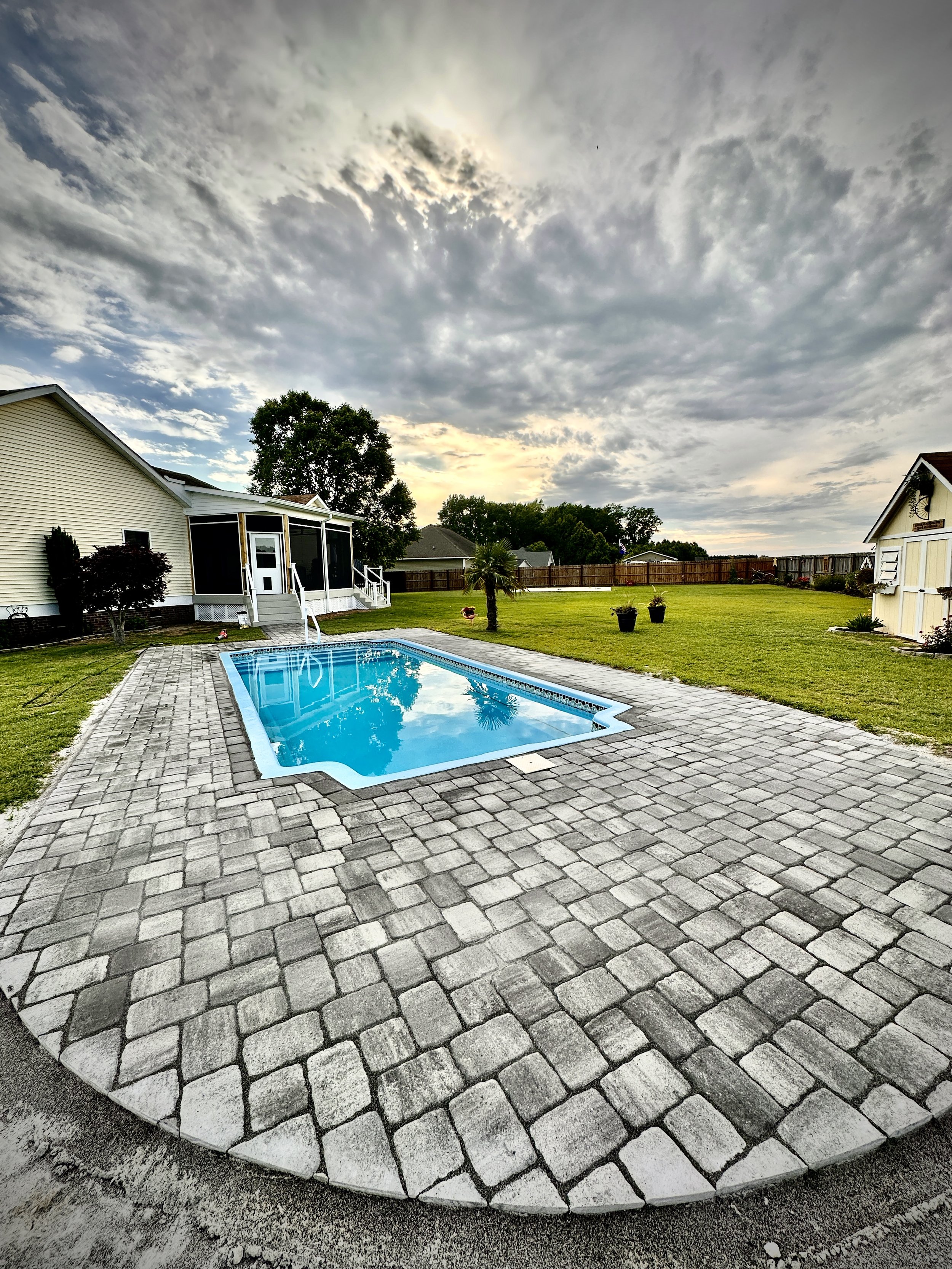 Completed in SC. It’s okay to already have something in mind, Our job is to bring it to life! These clients already had a drawing and that’s exactly what we did. A beautiful high-end paver patio really ties in to their custom built home!