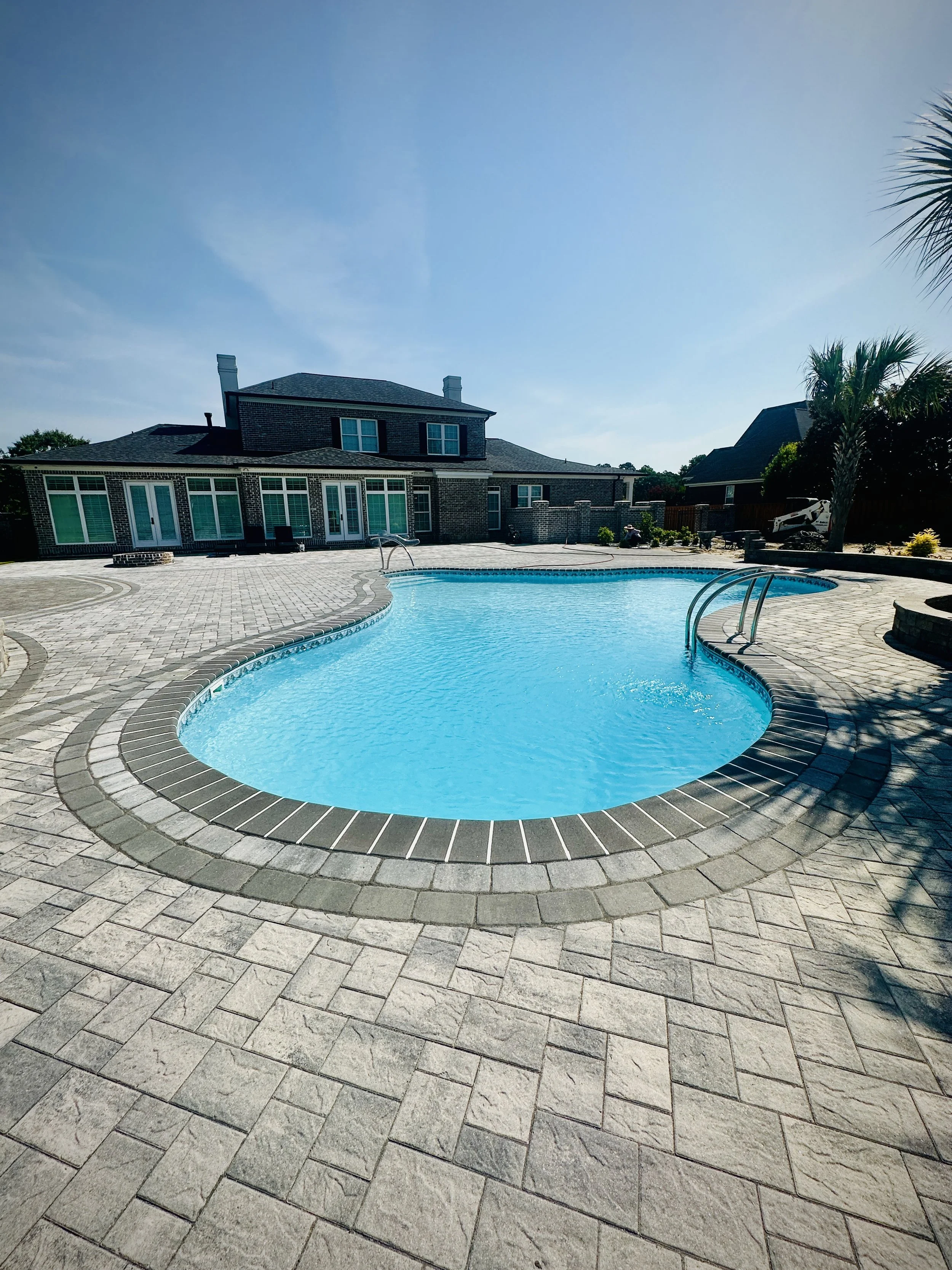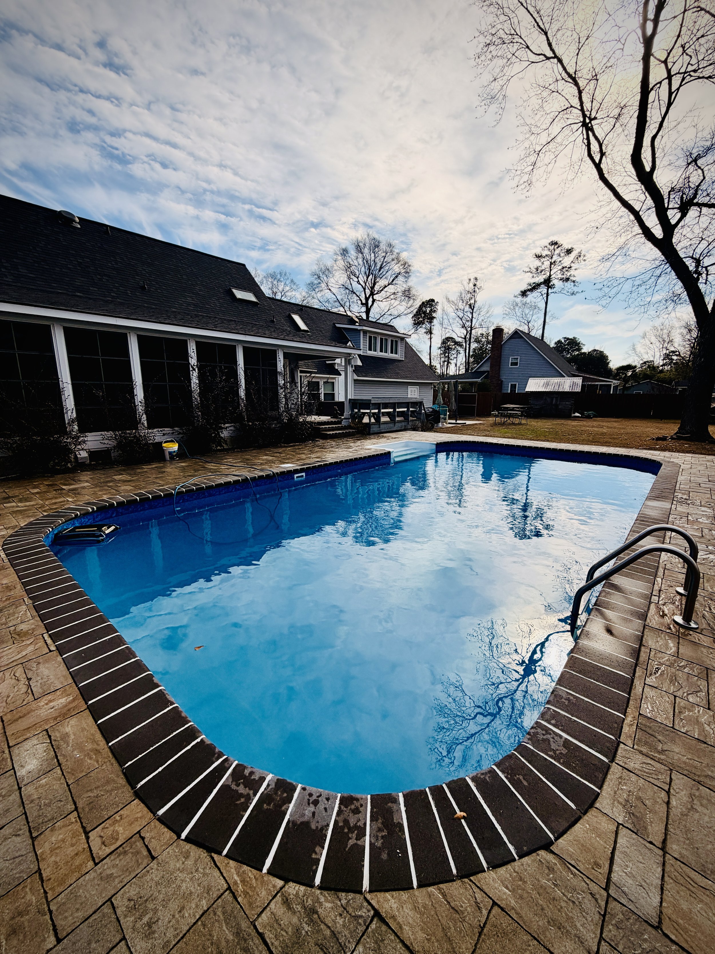 Completed in SC. We don’t just do modern, we also love whenever a client decides to be a little different and chooses a rustic but appealing paver. A darker coping really makes the deck stand out just that much more!