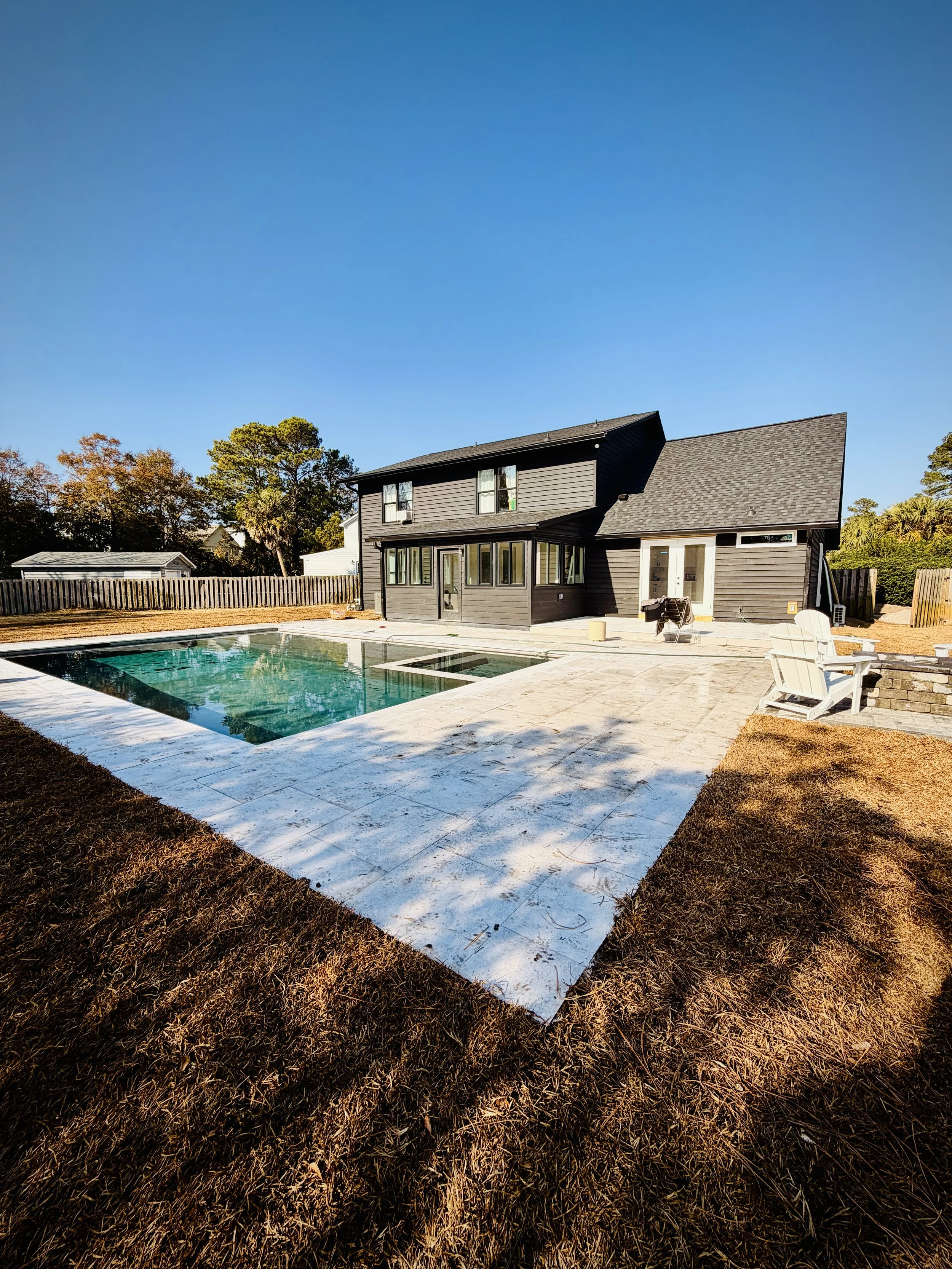 Completed in SC. Ask and you shall receive! This project consisted of a brand new swimming pool, firepit area, new irrigation system, new landscaping and a massive pearly white pool deck to enjoy during those hot summer months!